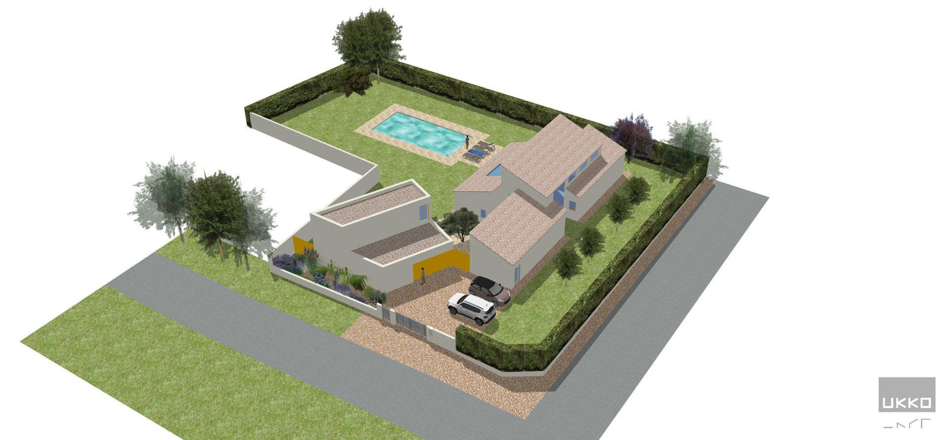 Extension à usage de stationnement, stockage, atelier. Objectifs, outre les besoins fonctionnels: réduction des vis-à-vis, création d'une identité de coeur de village en continuité du bâti ancien du hameau et en alternative aux dispositions des pavillons individuels en lotissement. Chantier en cours.